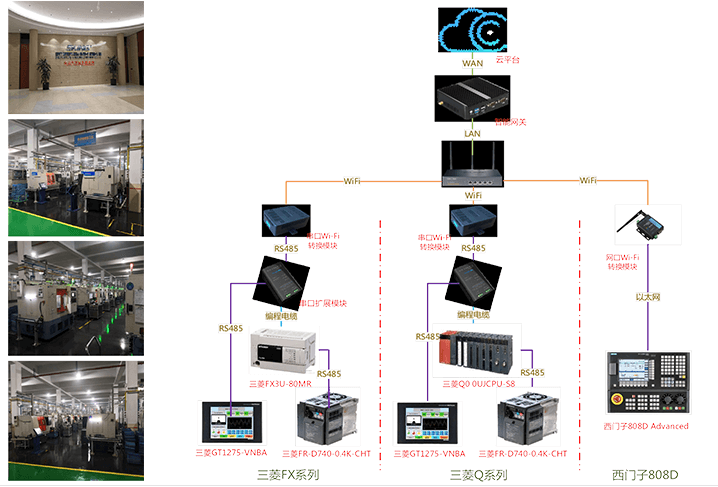 某轴承生产工厂数字化改造项目,自动线磨加工区共64台磨床,设备使用了三菱FX3U系列、FX2N系列、 Q系列PLC和西门子808D ADVANCED CNC等多种控制器。